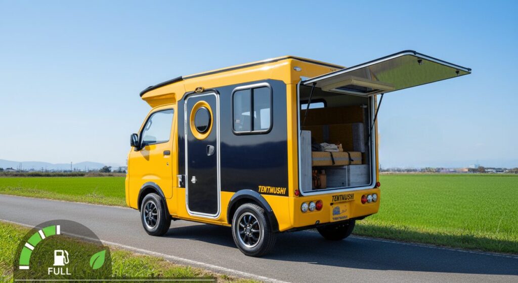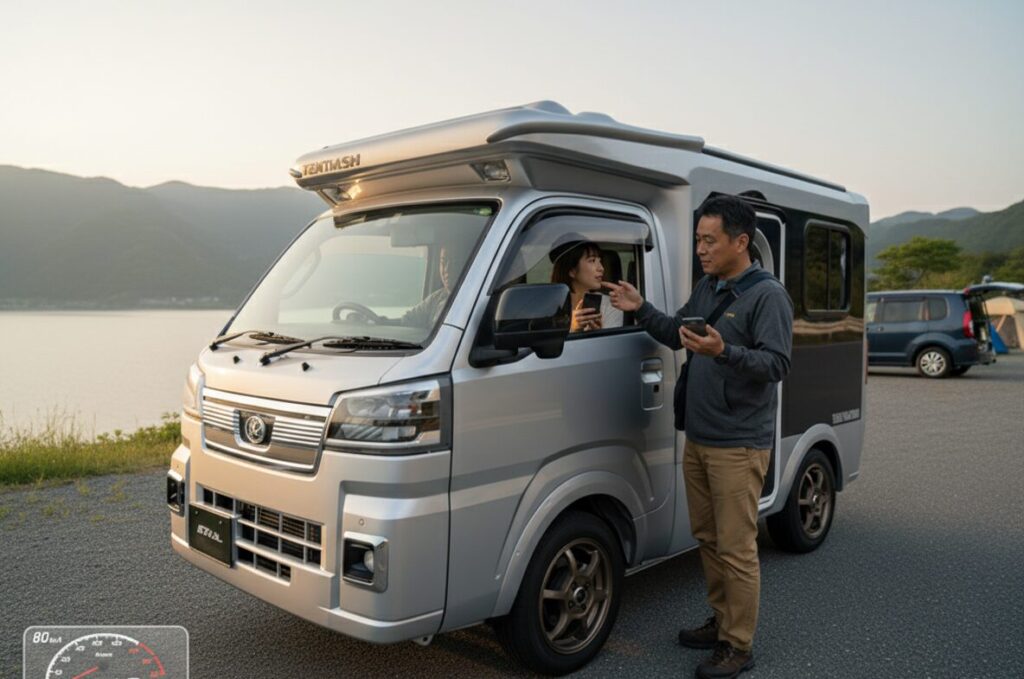 日常の買い物から週末の車中泊まで、一台でシームレスにこなせるのが最大の魅力です。 - 第2位:軽キャブコン(テントむしはこの種類) (燃費目安: 10~14km/L)